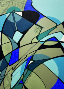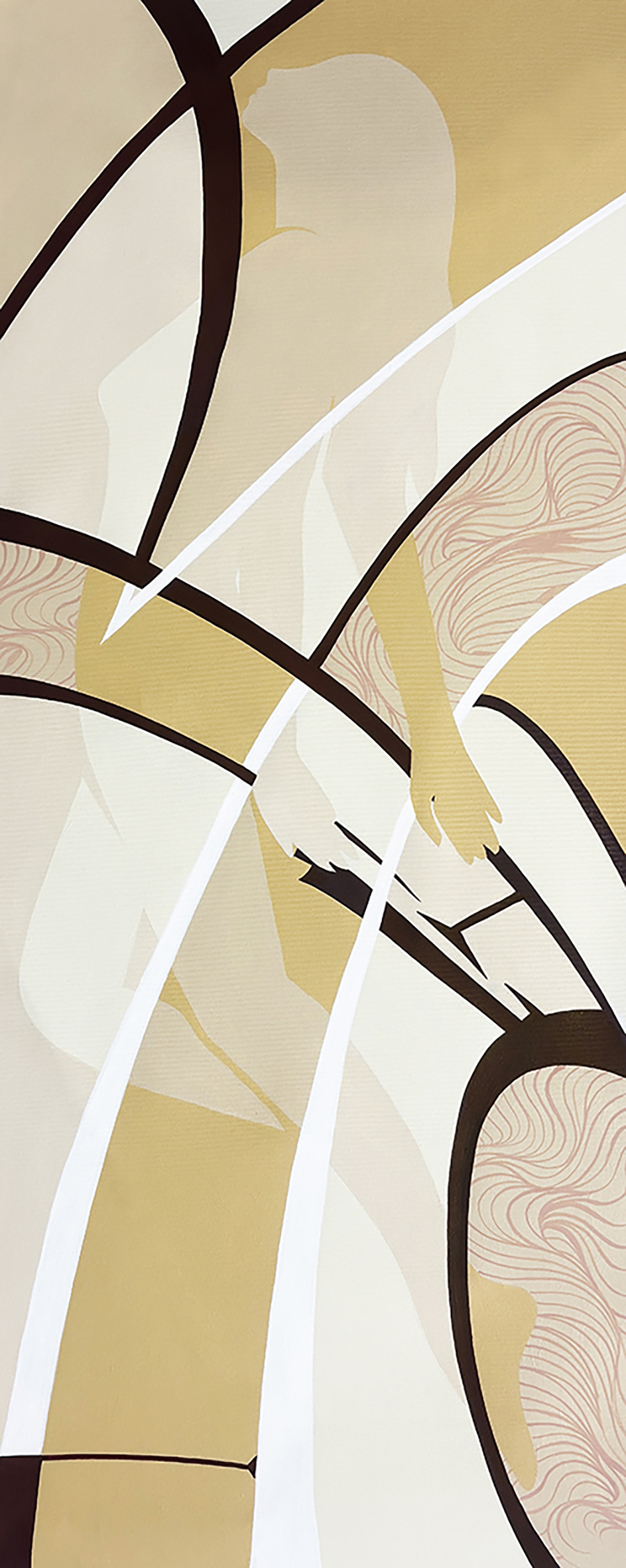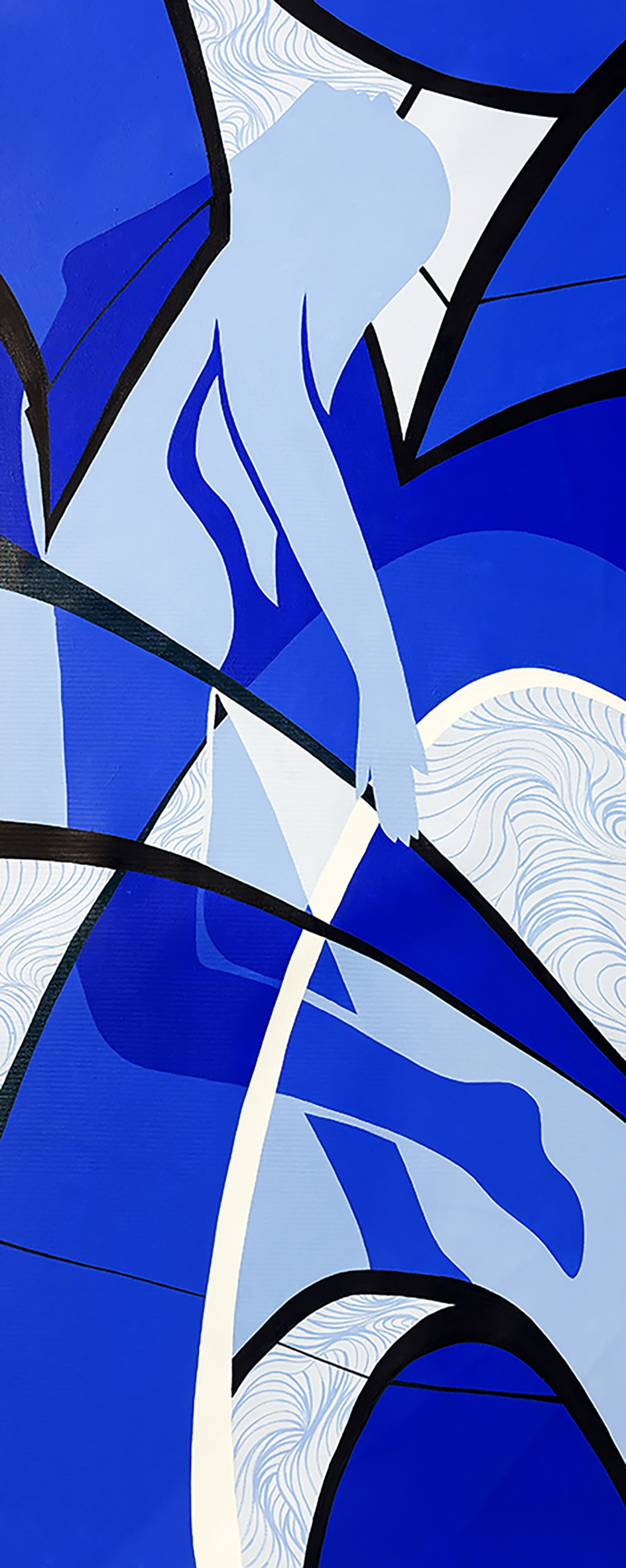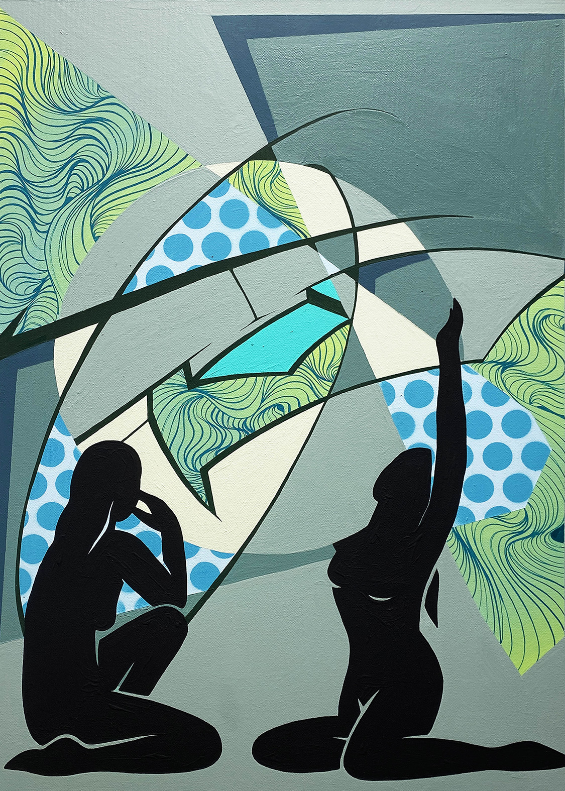 D’un côté, des femmes graphiques, libres et douces de Julia. De l’autre, des lignes énergiques de Cédric, comme une structure qui encadre et rythme l’espace. Ensemble, ces formes se répondent, s’enlacent et se complètent, créant une harmonie nouvelle où la couleur devient un fil conducteur de cette conversation picturale.